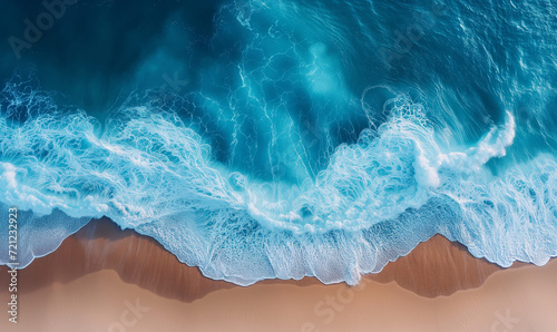 Ocean's Embrace: Aerial Perspective of the Shimmering Shoreline Where Waves Meet Sand in a Mesmerizing Dance, Top view with the drone