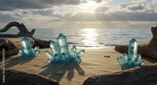 Oceanside Crystal Clusters at Sunrise - Tranquil beach scene with three clusters of light blue crystals resting on the sand, symbolizing serenity, purity, energy, nature