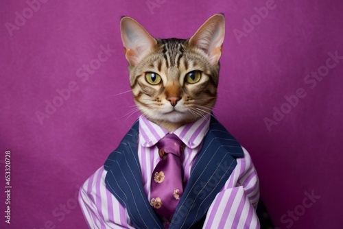 ocicat cat wearing a striped sailor dress against a vibrant purple background