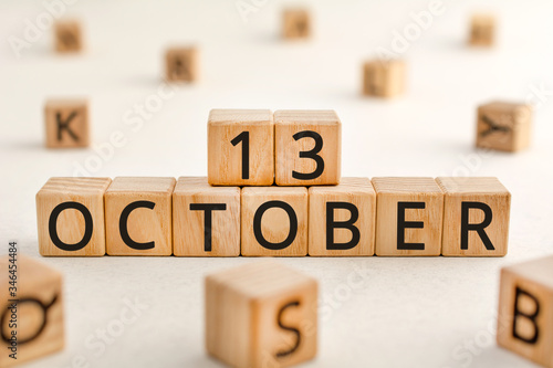 October 13 - from wooden blocks with letters, important date concept, white background random letters around