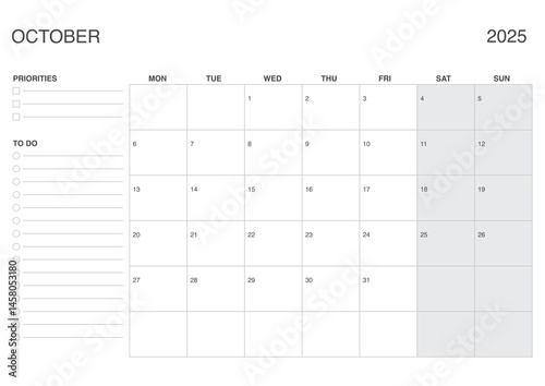 October 2025 A4 Monthly Calendar, Dated OCTOBER Planner