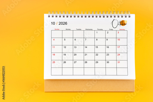 October 2026 Monthly desk calendar for 2026 year on yellow color background.
