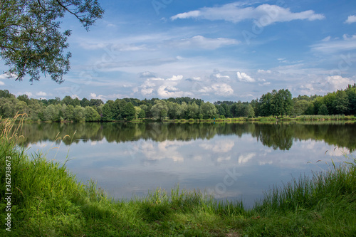 Odbicie obłoków w letnim stawie, Pogwizdów, Powiat Cieszyński