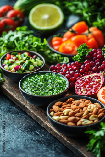of fresh fruits and vegetables on wooden table showcasing vibrant smoothies and nutritious salads.