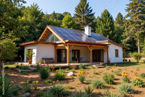 off grid villa powered by solar and wind energy with water reuse system and composting area surrounded by forest