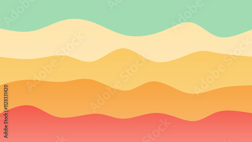 Off red, yellow and green coloured wave patterned background with a flowing design