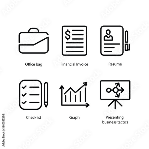 Office bag, Financial Invoice, Resume, Checklist, Graph, Presenting Tactics, icon