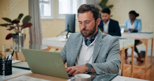 Office, businessman and developer with laptop for typing, software solution and research for ux. Coworking, male person and web designer with digital for connection, page review and seo information