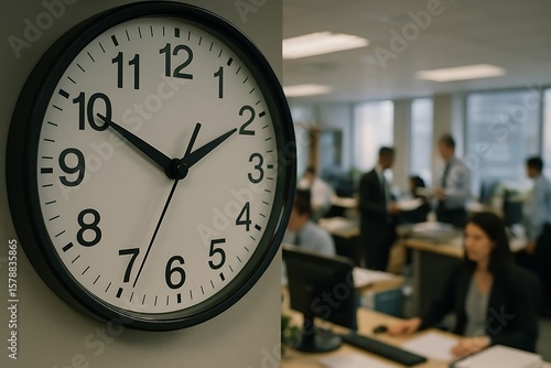 Office clock focused on as workers are seen in the blurred background, emphasizing time passing and the fast paced work environment of a corporate office