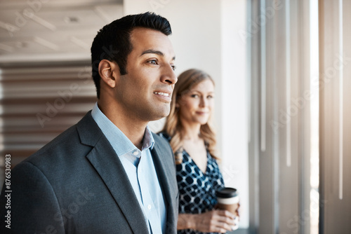 Office, company and business people by window thinking for solution, brainstorming and company project. Corporate workers, vision and happy man and woman for professional career, teamwork or ideas