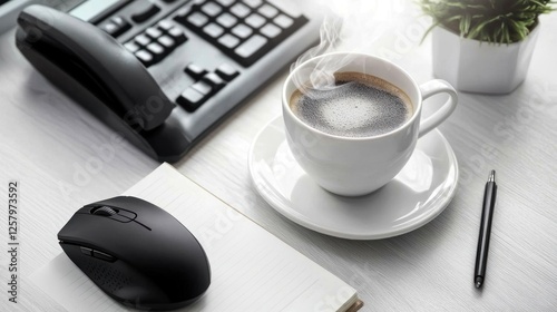 Office desk coffee break, computer accessories, plant