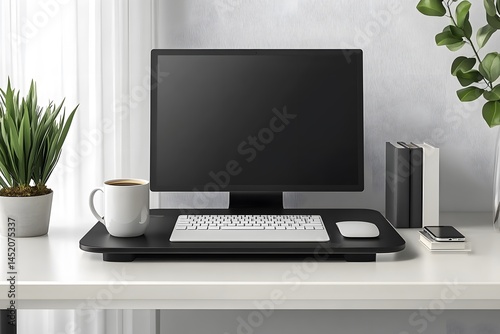 office desk setup with digital tools, coffee mug, smartphone, organized space, stock photo style, realistic,