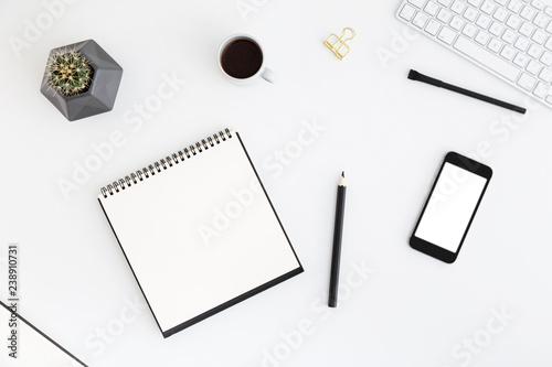 Office desk table with laptop, smart phone, cup of coffee and supplies, isolated on white background. Top view with copy space, flat lay.