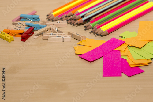 Office desk with group of pencil,note and clothespin on wooden desk,pink pencil on wooden desk,copy space