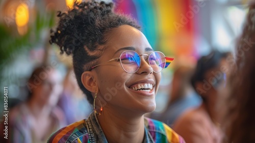 Office environment with LGBTQ+ employees openly expressing their identities, displaying Pride symbols and promoting a culture of acceptance and gender diversity. Colleagues engage in discussions