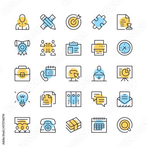 Office line icons. Set of office work icons. Black, blue and yellow colors. Modern outline graphic design. Vector line icons set