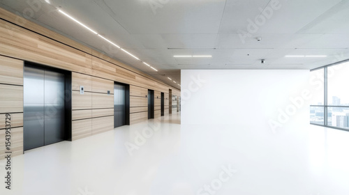 Office lobby with white wall, sleek and modern office corridor or lobby, featuring a long wall clad in horizontal light wood panels with three dark grey elevator doors. Opposite this, a vast
