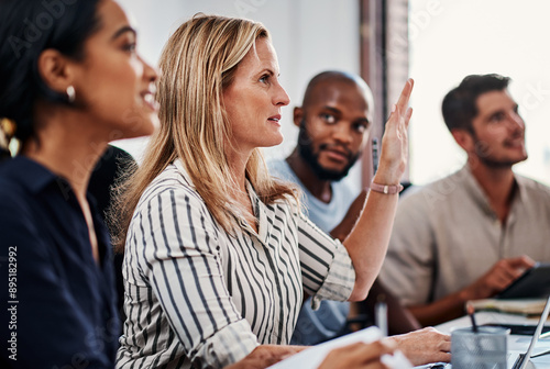 Office, meeting and business people with questions at workshop for project development, growth or planning. Ideas, support and team in conference room for proposal, objectives and employee engagement