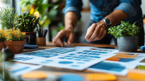 Office scene with person arranging design materials on table surrounded by plants, showcasing creativity and organization in professional environment