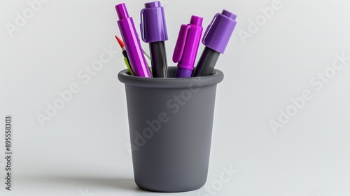 Office setup with a modern gray pencil cup and purple stationery, isolated on white.