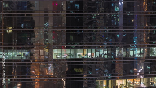 Office skyscraper exterior during late evening with interior lights on and people working inside night timelapse