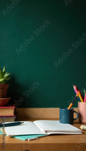 Office supplies neatly arranged on notepads before chalkboard, chalkboard, education, learning
