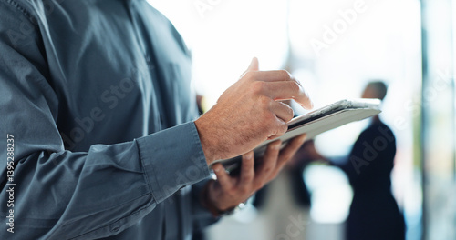 Office, tablet and hands of business man in boardroom for online notes, research and planning. Professional, corporate and worker on digital tech for website, networking and strategy in discussion