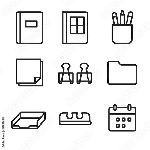 Office Tool Icons. Outline icon set of organization tools: notebook, planner, pen holder, sticky notes pad, file folder, binder