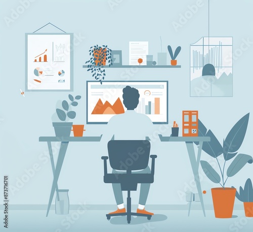Office Worker Analyzing Financial Data on Computer Multiple Screens - Vector Illustration