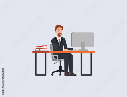 Office worker at desk behind desktop computer, flat vector illustration isolated.