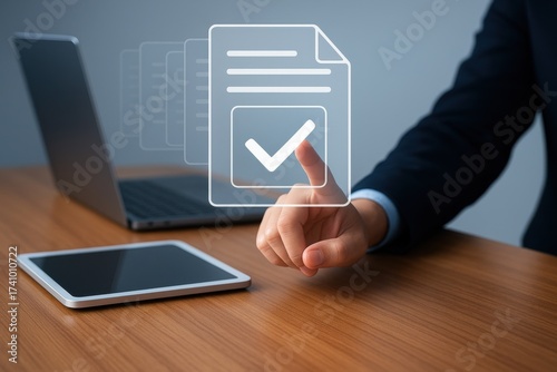 Office worker interacting with digital document interface on wooden desk with laptop and tablet in background