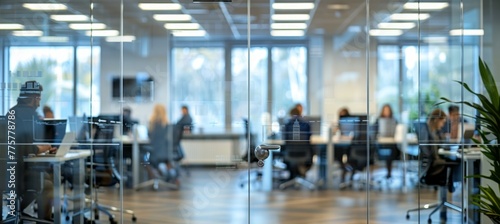 Office workplace blur bokeh background. Generative AI technology.