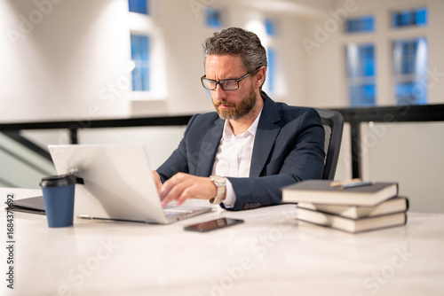 Office workplace. Handsome business man working with laptop at desk in office. Businessman typing on keyboard, online business meeting. Businessman working in office. Office worker using laptop.