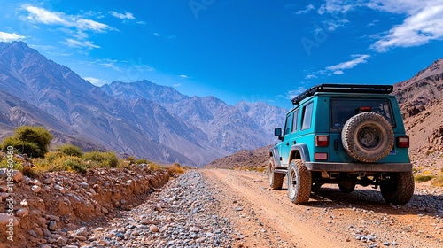 Off-road adventure journey mountain range rugged terrain rear view exploration in nature