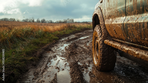 Off-road adventure on muddy path in rural countryside landscape