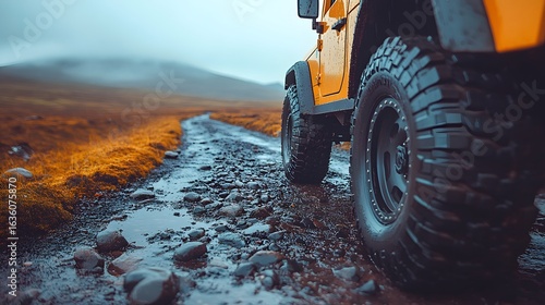 Off-road vehicle navigating a muddy trail in a rural landscape during a rainy day