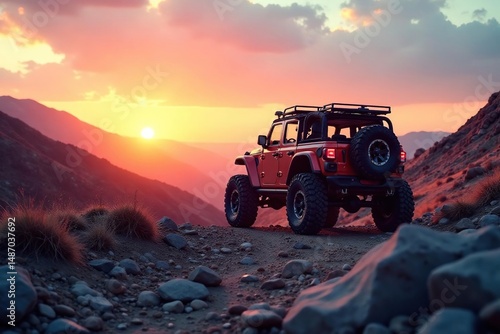 Off-road vehicle navigating rocky terrain, sunset, terrain, sky, rough