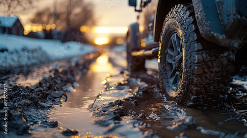 Off-Road Vehicle Tire in Muddy Terrain at Sunset - Generative AI