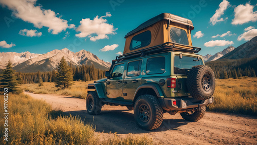 Off-road vehicle with rooftop tent stands on dirt path surrounded by mountains