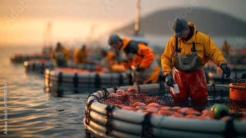 Offshore Fish Farm Workers Tending to Cultivated Aquatic Life in Coastal New England During Golden Hour