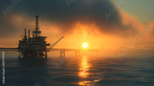 offshore oil platform silhouette, sunset reflection on water, energy industry, industrial backdrop, environmental impact, commercial viability, versatile design, marketing potential