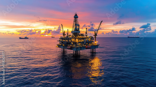 Offshore oil rig illuminated by sunset, surrounded by calm ocean waters