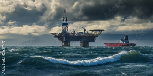 Offshore oil rig platform with a supply vessel positioned at sea, highlighting the oil industry's essential operations in marine environments. This industrial scene captures the intricate relationship