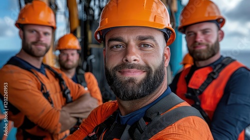 Offshore oil rig workers team portrait, ocean background, safety, industry