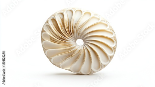 Off-white, circular sculpture with a central hole, composed of numerous thin, petal-like layers spiraling inward, creating a three-dimensional, swirling pattern; isolated on a white background