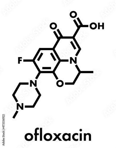 Ofloxacin fluoroquinolone antibiotic drug molecule. Skeletal formula.