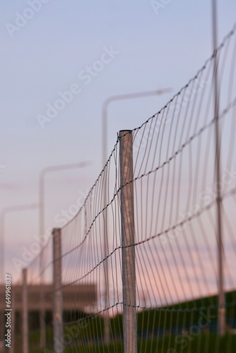 Ogrodzenie i latarnie na tle nieba. Druciany płot odgradza coś.