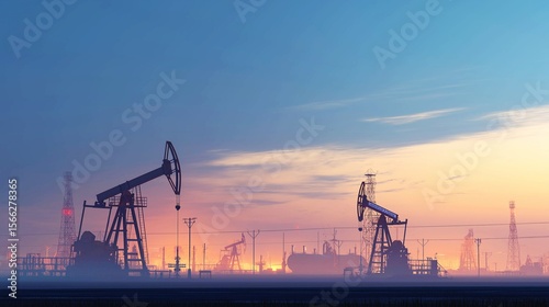 Oil and gas industry. Industrial landscape with oil pumps and oil rigs. Oil rigs against industrial cityscape at sunrise. 3D rendering.