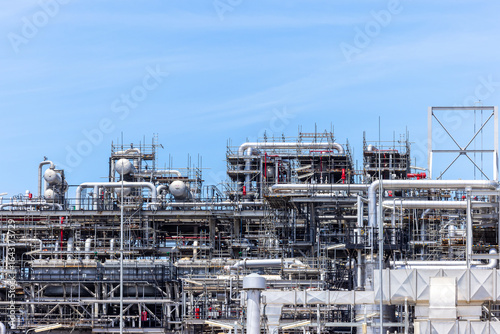 Oil and Gas refinery petrochemical plant industrial on blue sky background, Oil and Gas refinery petrochemical plant pipeline steel, Oil and Gas refinery factory maintenance, Global energy refinery.
