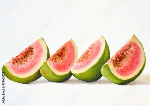 Oil painting depicting four wedges of guava with green and pink flesh separated and presented against a white background